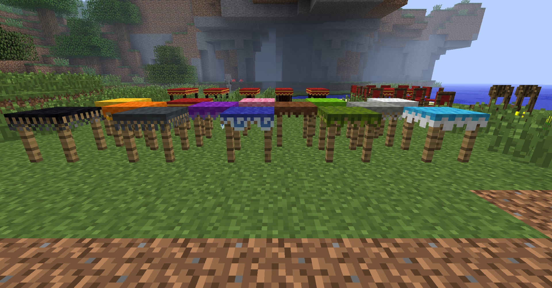 At this moment mod is very simple and contains only 5 tables and 2 chairs, but each can be constructed from 2 materials (right-click with block in hand). It's the same system, that "Carpenter's Block" mod use, but expanded. First material can be applied to bottom part of the block (from bottom to half height) and the second on another half. Tables also can be covered with tablecloth (right-click with carpet on top of block). Each color has unique pattern for side of tablecloth, based on it's color theme. Each material also can be colored (right-click with dye). Tables can be expanded with blocks of same type placed near them.