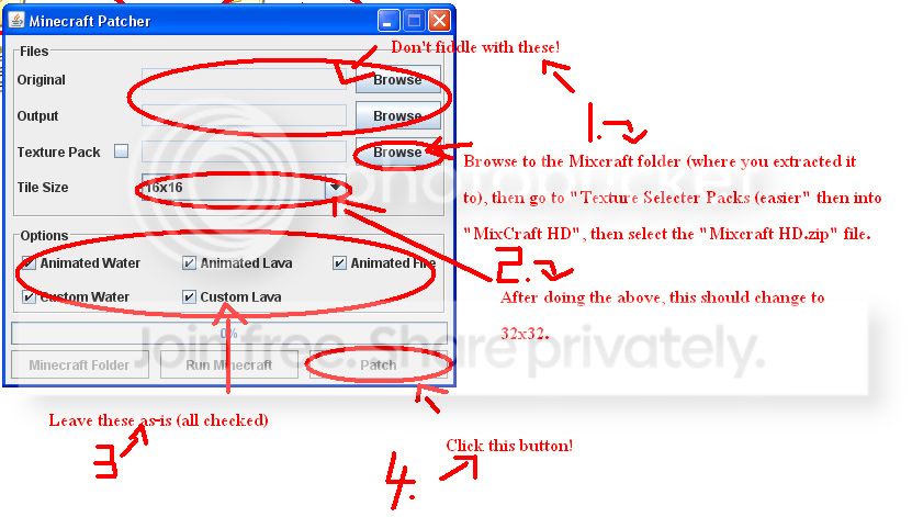 Extract the MixCraft zipfile before trying to install the patch with it. The download in the OP contains several MixCraft zipfiles, and several directories, different ones for different applications. There's one for MineCraft Classic (it may or may not work for the In-browser Alpha, not sure), there is the rest for the downloadable Alpha that you have to pay for. For the standard MixCraft HD version of the pack, go to where you extracted the MixCraft HD.zip file, and then follow the pictorial instructions below: