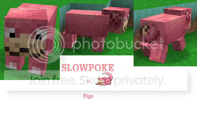 For my texture pack, i made pigs 'tepigs' and pigzombies 'pignite', so its like an evolved form. It actually looks realistic when tepig gets hit by lightning and turns into pignite. So if you made your pig slowpoke, make the pigzombie slowbro. You see what i mean? I actually used this for my texture pack, but mines not slowpoke, so ill give you my idea