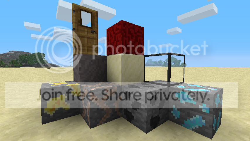 From left to right bottom row gold ore, iron ore, coal ore, diamond ore-middle row gravel, sand, glass-top row wooden door, netherrack.