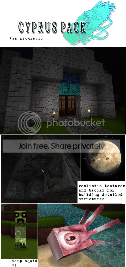 - pictures (all my texture come from pictures, I'm a cheat haha. It's hard to find some good pictures, however. I still need WHEAT, ORNATE PATTERNS, CAKE, BAMBOO, and TNT)
