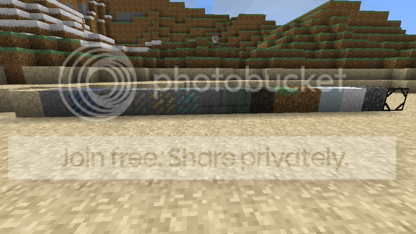 sand, stone, lapis ore, coal ore, iron ore, gold ore, diamond ore, cobblestone, mossy stone, bedrock, grass, dirt, clay, snow, gravel, glass.