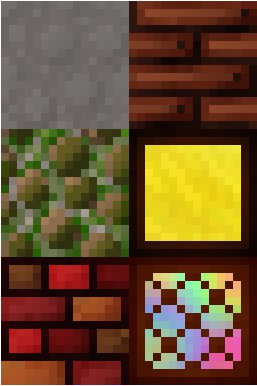 I am shooting for a New Years update, but I'm reworking nearly everything, so the terrain.png might not be finished by then. Here are more new (and/or retextured) textures: stone, wooden planks, mossy cobble, gold block, clay brick, and diamond block.