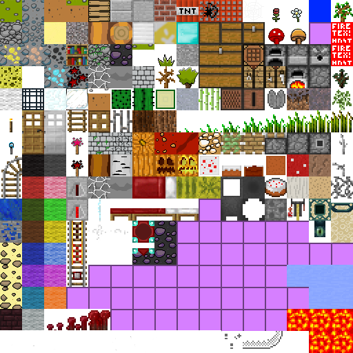 Also, the blurry textures of the terrain.png were beginning to become an annoyance, so I fixed it, as well as adding some new stuff. End stone, obsidian, wood, leaves, Nether stuff, cracked/mossy stone bricks, spiderwebs, and placeholder enchanting table and End portal frame. Glass is now a white frame due to shenanigans. http://u.cubeupload.com/Melty/terrain.png