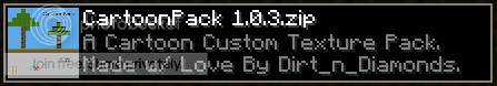 Introducing A New Texture Pack! Cartoon Pack This texture pack brings back the good old days of gaming and cartoonizes your minecraft world. This texture pack is in beta and doesn't have all textures completed yet, however I thought it was decent enough to provide a download link for you guys to try it out. Below are some images of the texture pack and at the bottom is the download link - enjoy. Also any feedback you guys give me I will take into consideration. Say you don't like a certain texture etc. But please constructive critisim only.