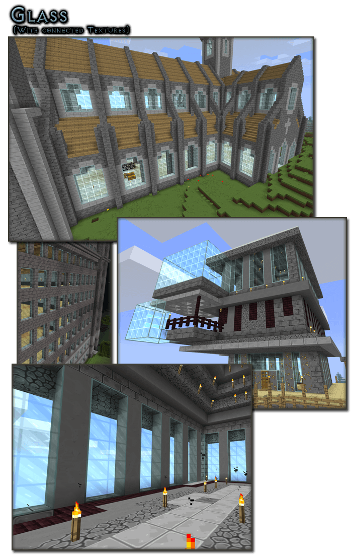 About your warning under the downloads picture about needing MCPatcher even if running Optifine: I run just Optifine, and I still get connected textures, as evidenced by the glass in the screenshot below. The only things that the CTM part of Optifine doesn't seem to work on are those textures that you haven't replaced, such as the bookshelves.