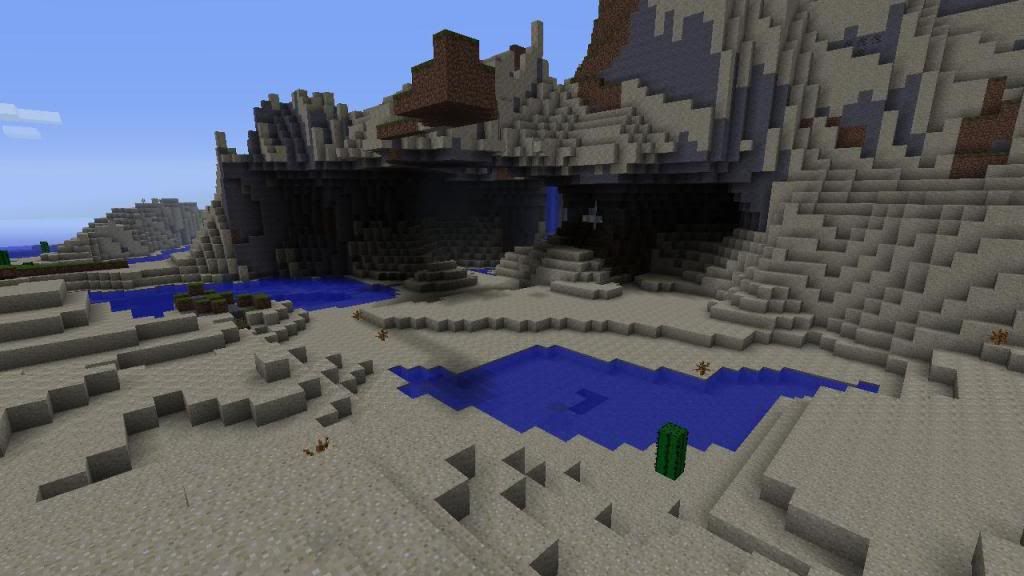 Viewed from a grassy knoll, a cross hangs high above a valley of epic proportions, and yet from the wrong angle it hides from view camouflaged by the mountain beyond. Generous proportions of landscape are cut into the air by sand driven mountains and a spectacularly large looking cave entrance; though it is just a folly, it makes for a shadowed part of the journey through this land. Look up at the back of this shadowy hole, and their high above is a glimmer of sunlight. One might be think that this would be the ideal place to build a first settlement even with the lack of trees. This map has so far had 4 mob spawners.