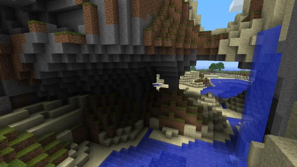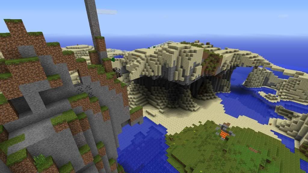 As I entered the world generated by this seed I was immediately drawn to this natural tunnel of stone and dirt, what an awesome place to carve out a castle or build a house on top of it!