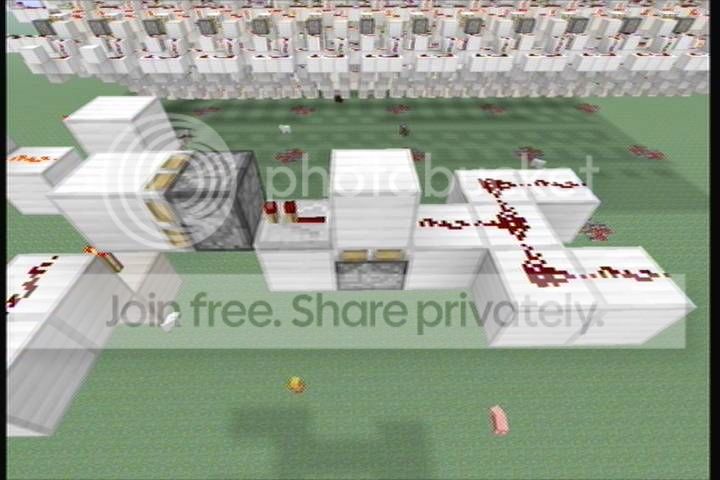 ^^^ First you need to OR the inputs into a T flip flop. A monostable circuit limiting a pulse to 1 tick outputting to a sticky piston will create a block dropper, which makes a great T flip flop when an emitter is used to power the moving block. Note that this monostable circuit will only work when facing east or west, it is very susceptible to the North/South Quirk. If this is a problem, feel free to use a different design.