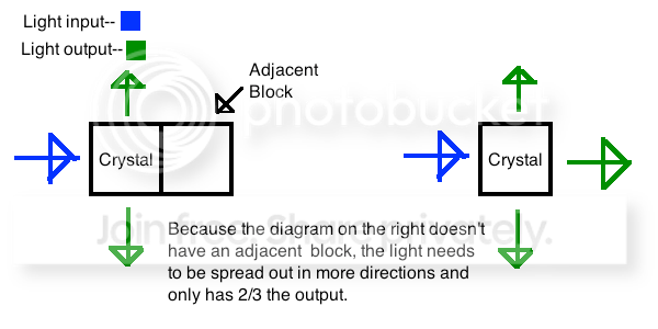 As stated Crystals should have the ability to redirect light. The Crystal's light output is determined by the highest light level adjacent to it.