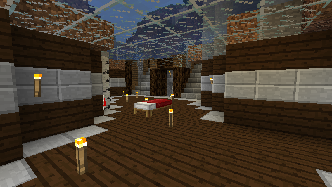 This is my survival in Pocket Edition, I own computer edition but generally play this version more. I play on my iPod 5g. I haven't been playing to long so there's still a lot of stuff I'd like to add. I also am using no duplication glitches, all the resources collected are completely legit and I am not playing on peaceful. My main base area is actually underground with a secret(ish) water entrance and everything is built at natural spawn, which makes people joining or me dying less of a pain. The whole "bigness" goal of my base has been inspired by Etho. My base also goes under the lake a bit so I have built a window which looks pretty neat.