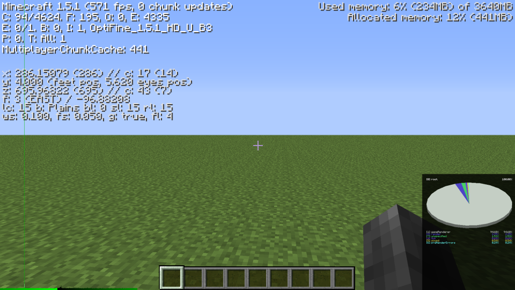 That's the "Frame Rendering and Internal Server" color spiking up past the top of the screen, in the middle of a brand new superflat world while I stand still. My computer specs are: