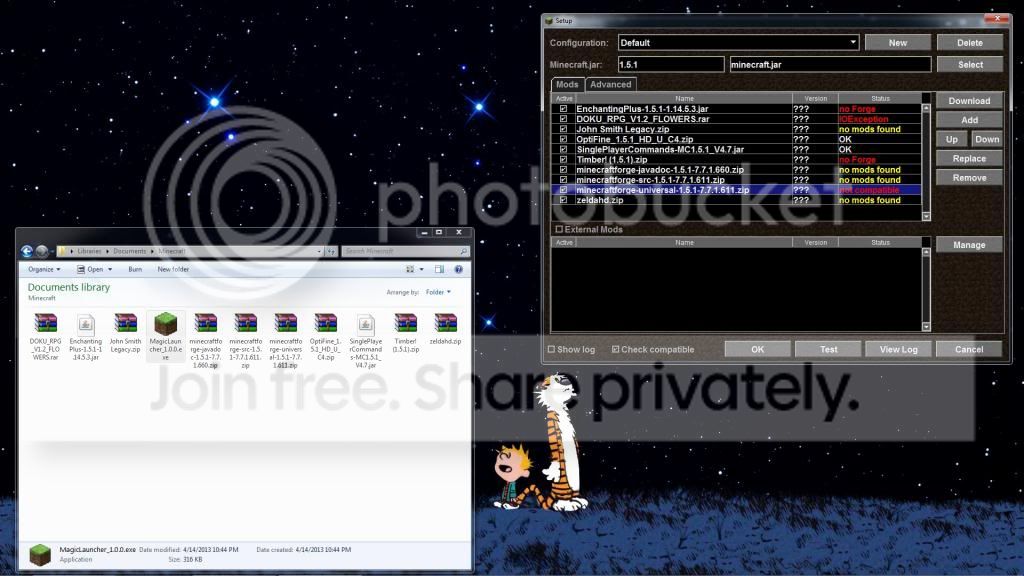 First, you need to have Minecraft Forge on the top of the list in Magic Launcher. That's one of the things Magic Launcher does. It allows you to arrange mods so as that class files with the same name will be overwritten in any pattern that suits your needs.