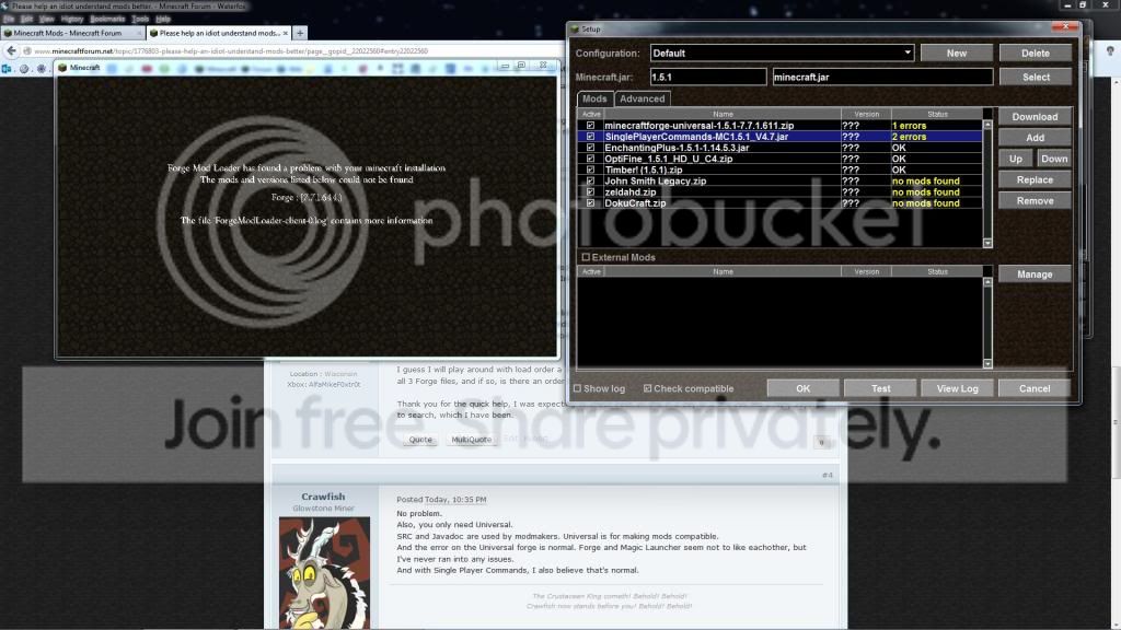I moved all 3 Forge files to the top of the list, which reminds me of one question I forgot about. Do I need all 3 files? I didn't know what to download and install, the Javadoc, SRC, or universal. When I moved all 3 to the top, the Forge universal changes to "1 errors". Enchantingplaus and Timber change to "OK" and singleplayer commands changes to "2 errors".