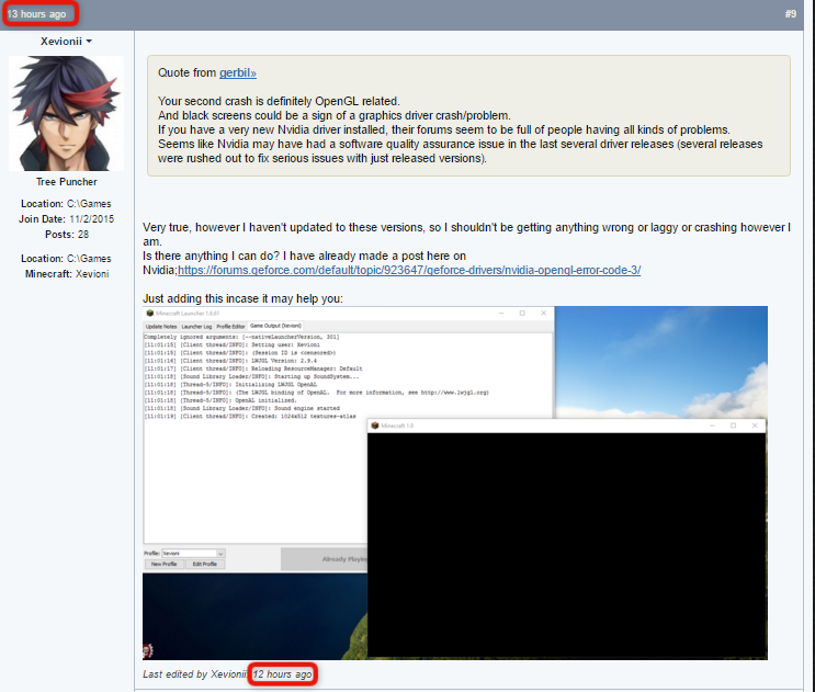 If any other moderator comes in and wants to know the problem that is current: It is that my Minecraft launches, I can adjust things, however after getting in (sometimes doesn't get that far, but quite rare) it will freeze, then load or whatever (start responding/stop freezing) and the screen will go black, in some cases the drivers will crash and Minecraft will crash with OpenGL error code 3.