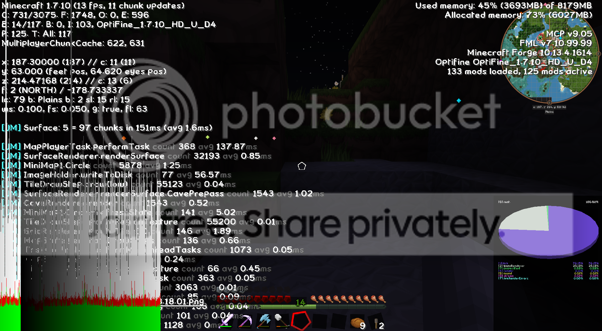 I recently came back to Minecraft after a pretty long hiatus and am having just a ton of problems getting this thing to run properly this time around. I'm playing single player (not on a server) using v1.7.10 with the latest version of Forge (latest v1.7.10 version anyway). Have also tried installing OptiFine, but it hasn't really made a difference. I'm consistently only getting around 10-15 FPS (which is monstrously lower than what I used to get) and the debug screen seems to indicate something weird is going on with my tick rate. Although, if we're being honest, I've got no earthly idea what that means lol...